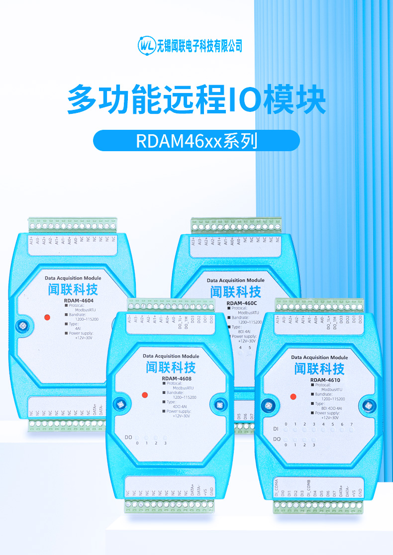 RDAM-46xx是一个基于标准Modbus RTU协议的远程模块,可以与组态软件、工控屏、PLC等支持MODBUS主机的设备组网。RDAM-46xx系列共有四种模块: