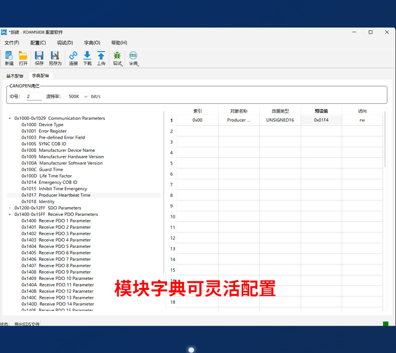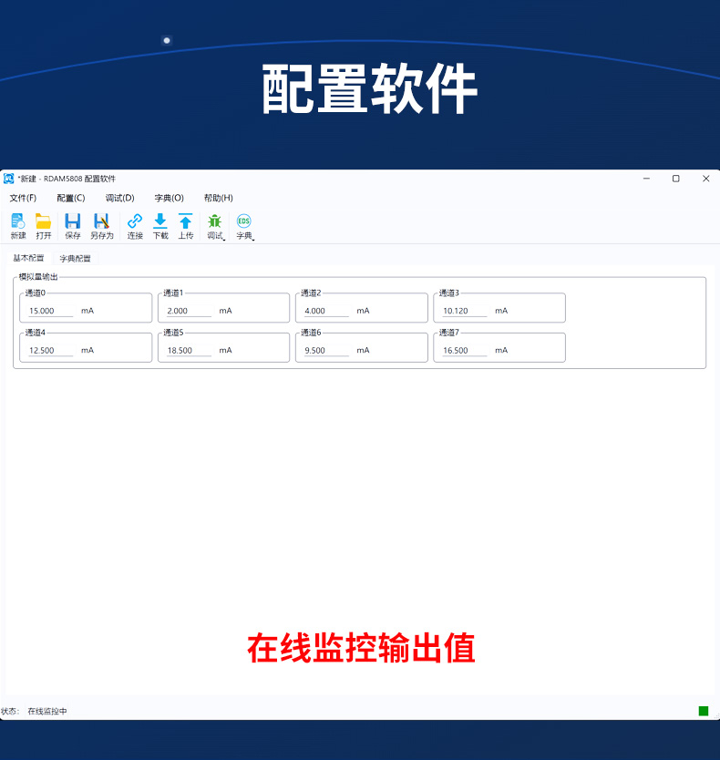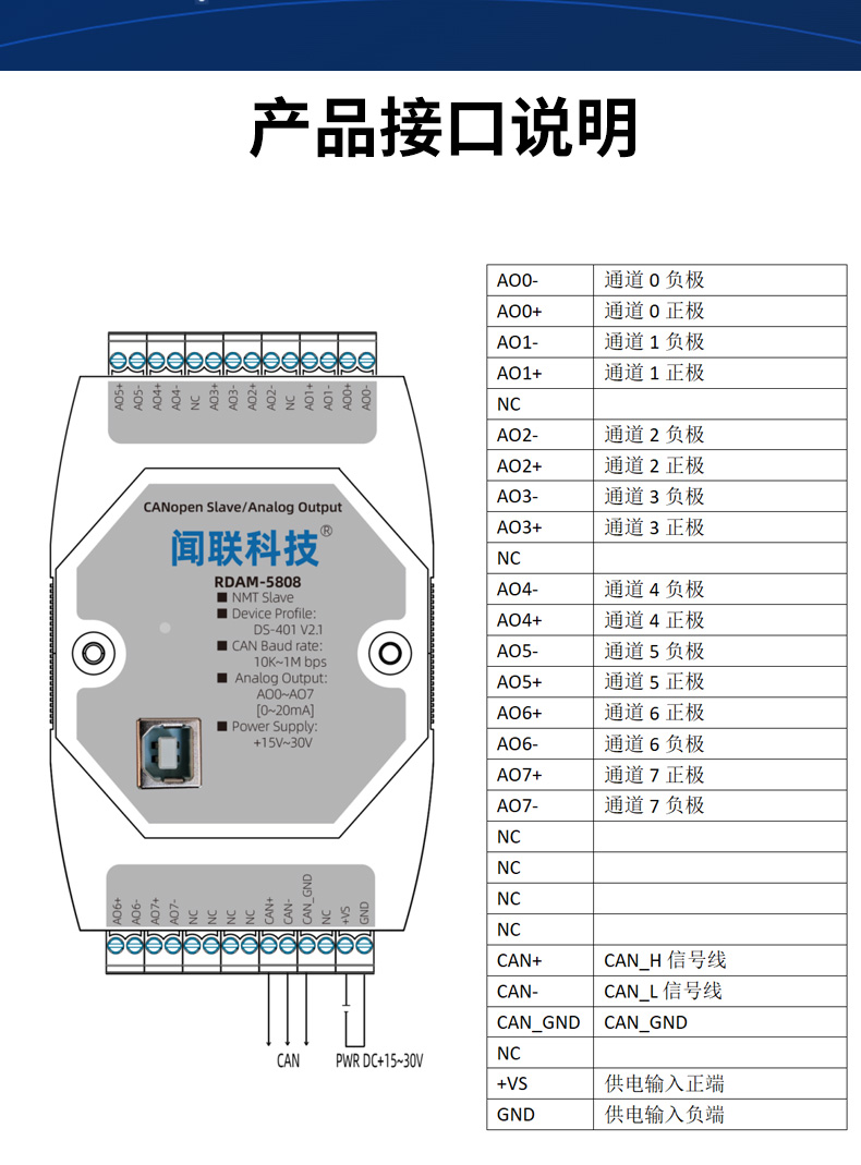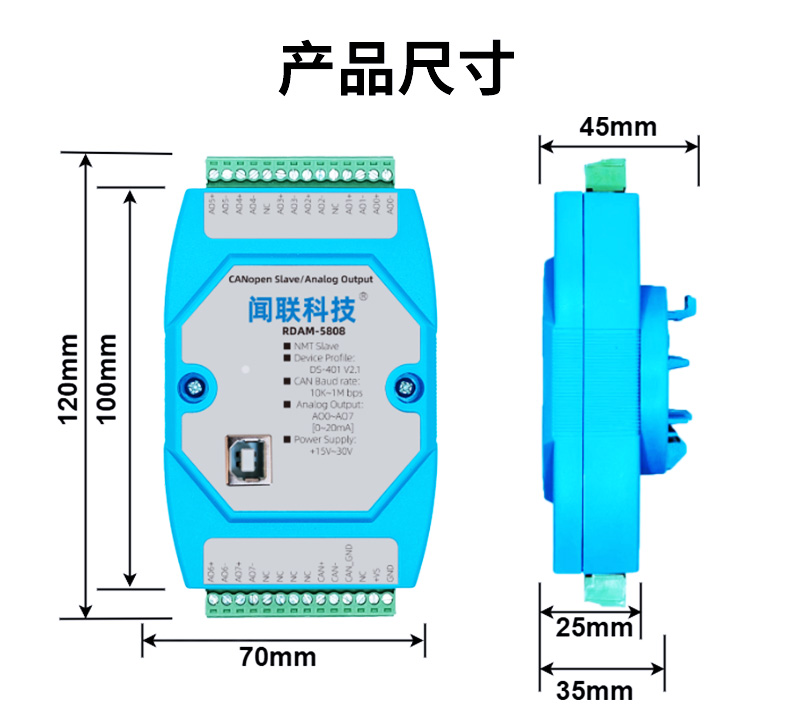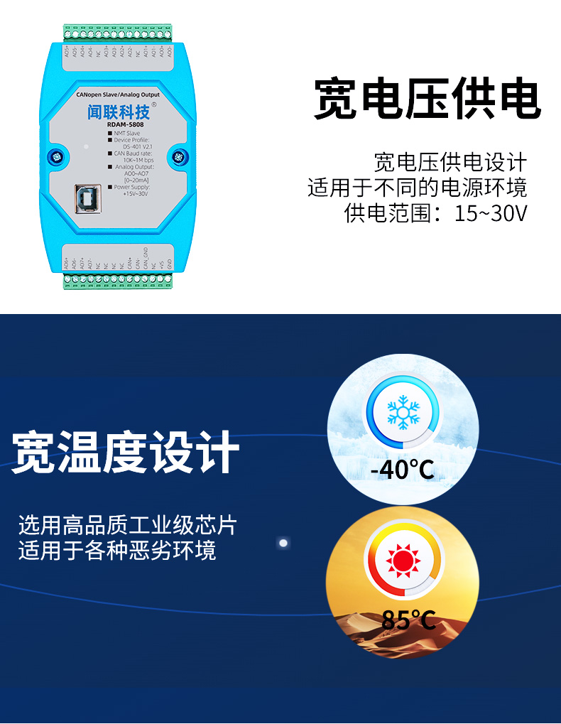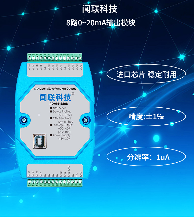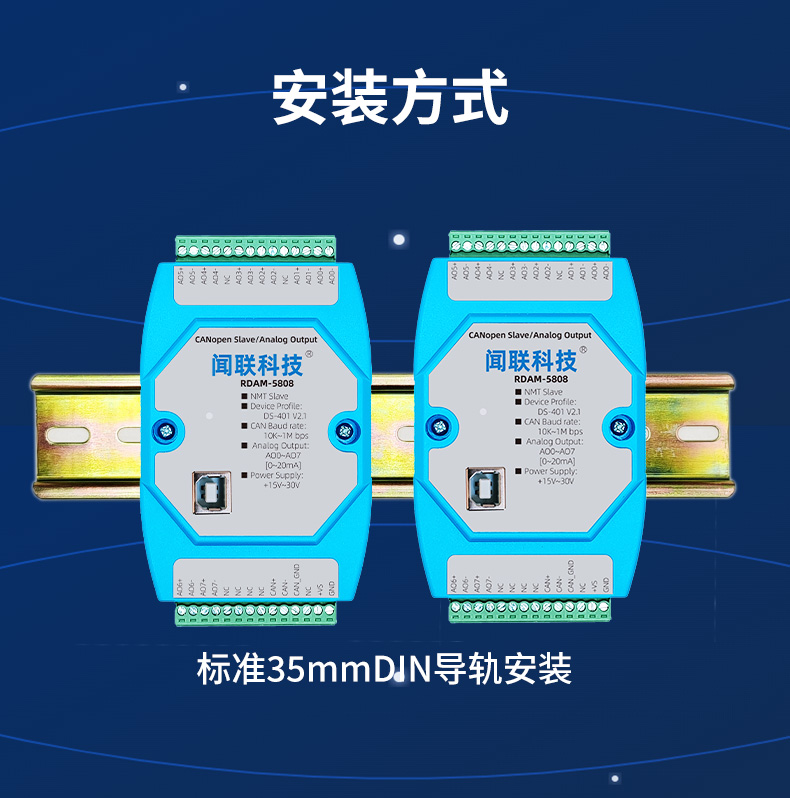 - RDAM-5808是一个基于CANopen协议的远程IO模块,可以与组态软件、工控屏、PLC等支持CANopen主机的设备组网。本模块具有8路0~20mA模拟量输出,CAN通……