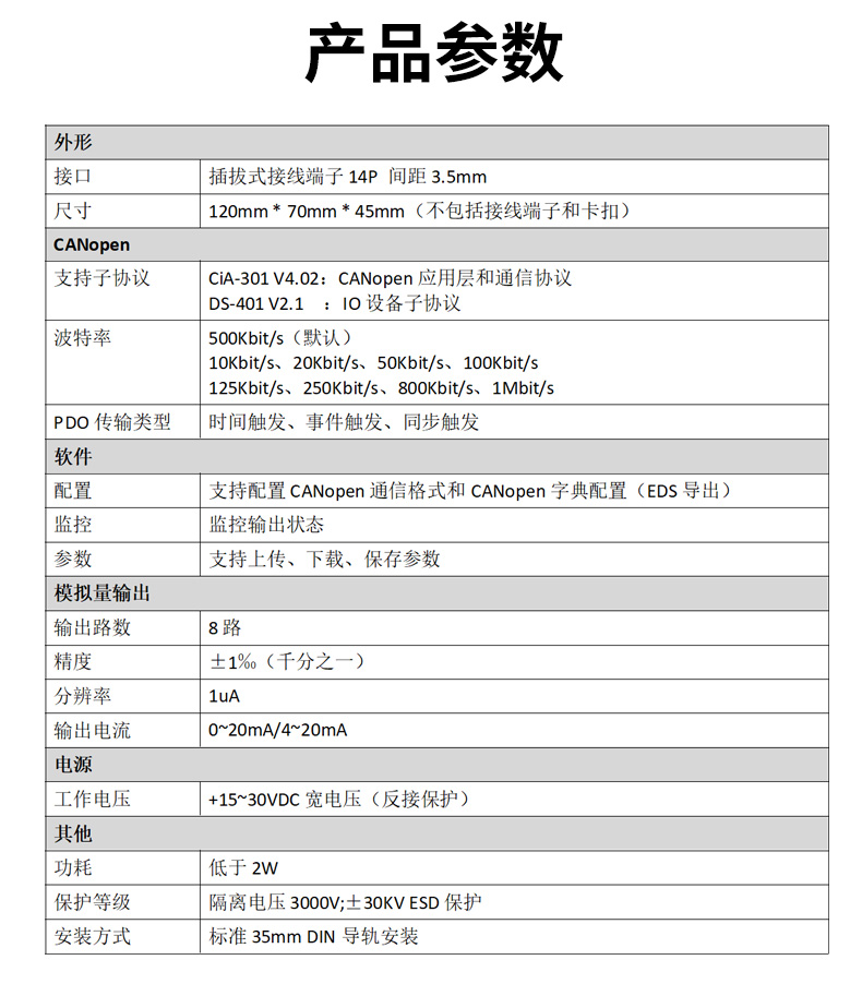 RDAM-5808是一个基于CANopen协议的远程IO模块,可以与组态软件、工控屏、PLC等支持CANopen主机的设备组网。本模块具有8路0~20mA模拟量输出,CAN通信全隔离适用于各种复杂的环境。